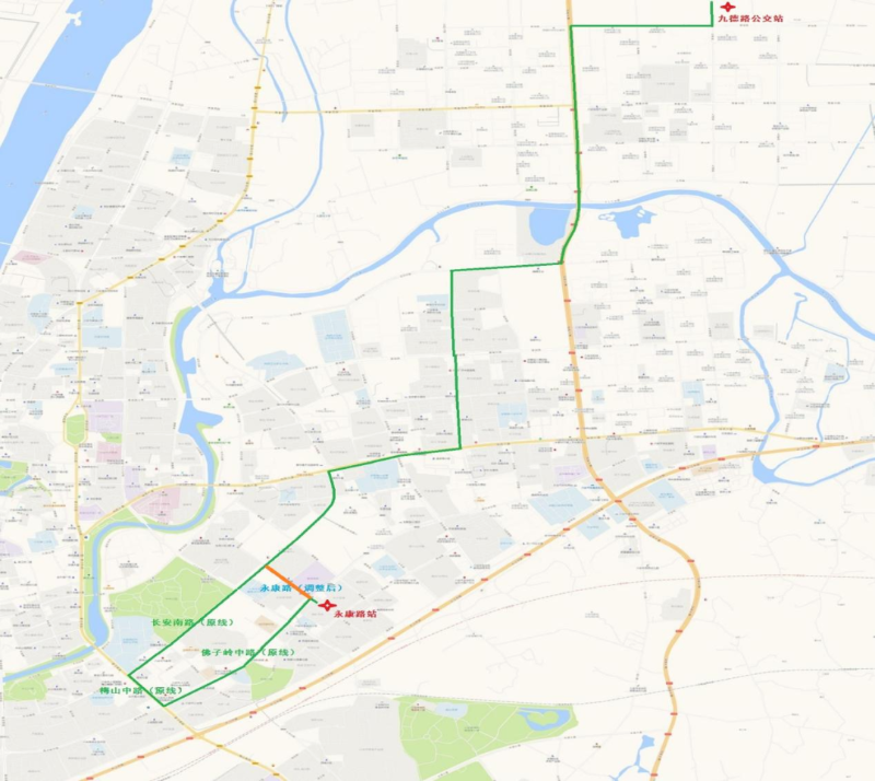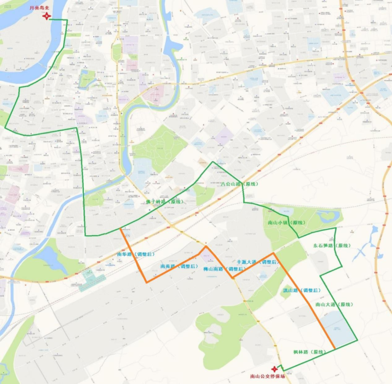 3、优化调整后线路走向:文化路桥—淠河路—响洪甸路—大别山路—解放南路—佛子岭中路—南华路—南苑路—梅山南路—丰源大道—洪山路—枫林路—梅山南路;
