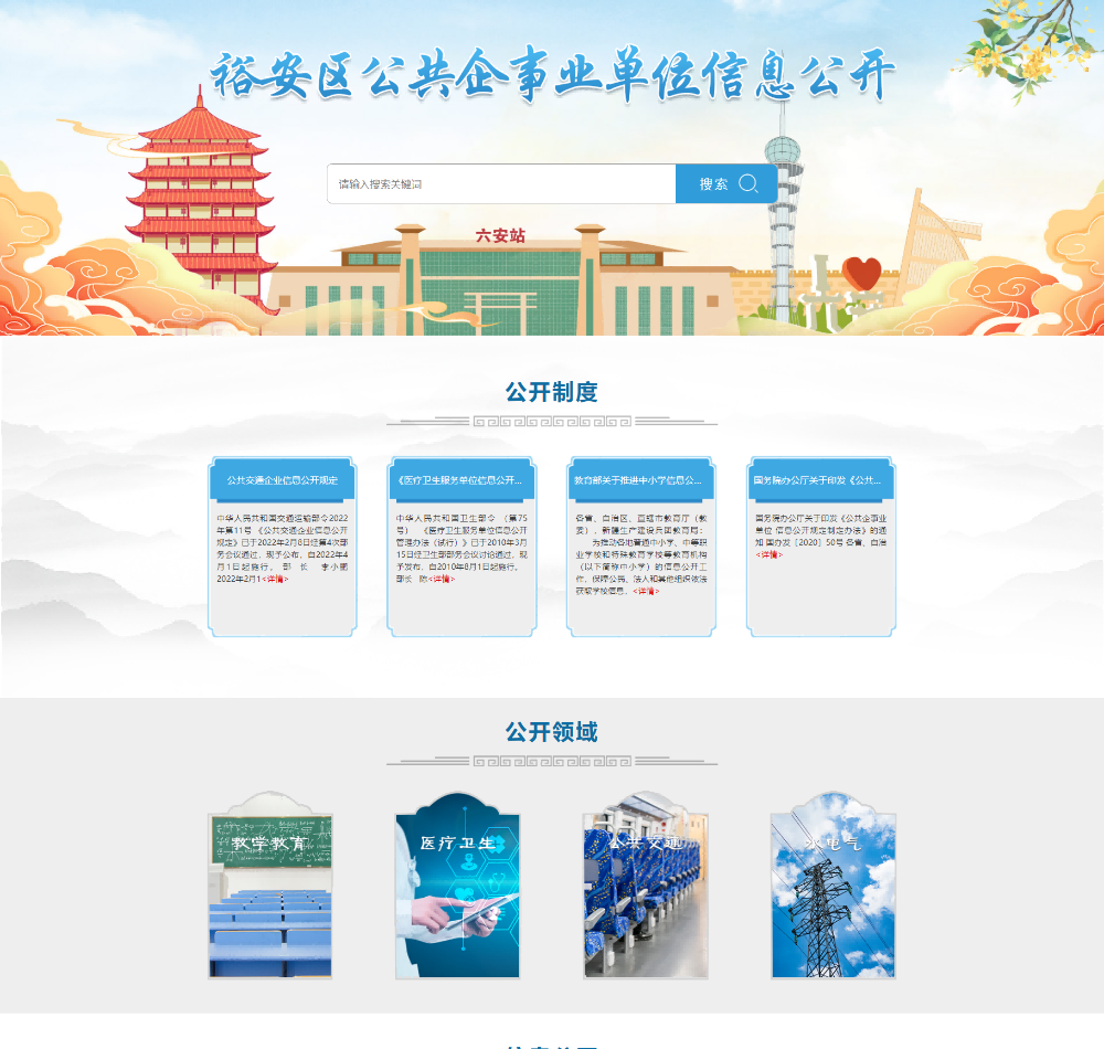 为全面贯彻落实省、市政务公开重点工作任务部署,裕安区升级改造“公共企事业单位信息公开”专题,全面推进教学教育、医疗卫生、公共交通、水电气等重点民生领域公共企事业单位信息公开规范化、标准化、便捷化,让政务公开更加亲民、便民、惠民。