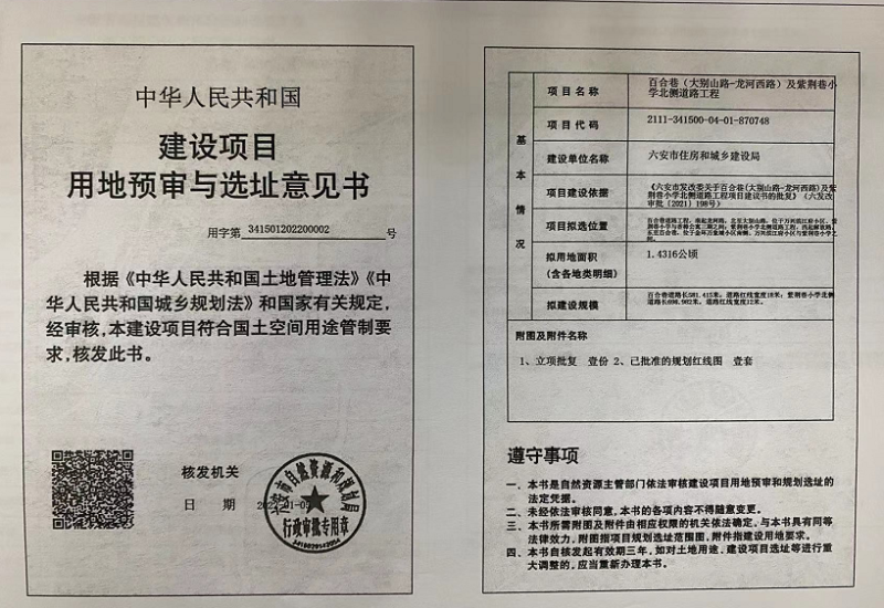 百合巷(大别山路-龙河西路)及紫荆巷小学北侧路道路工程建设项目用地与选址意见书