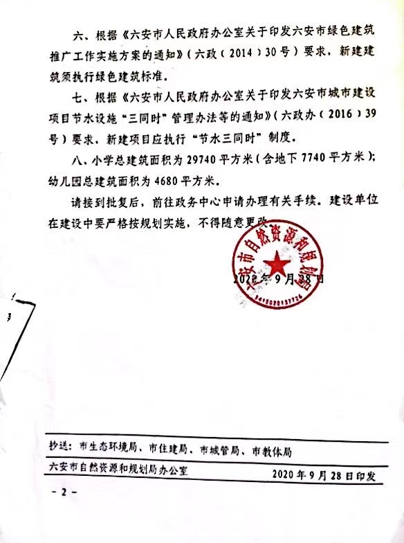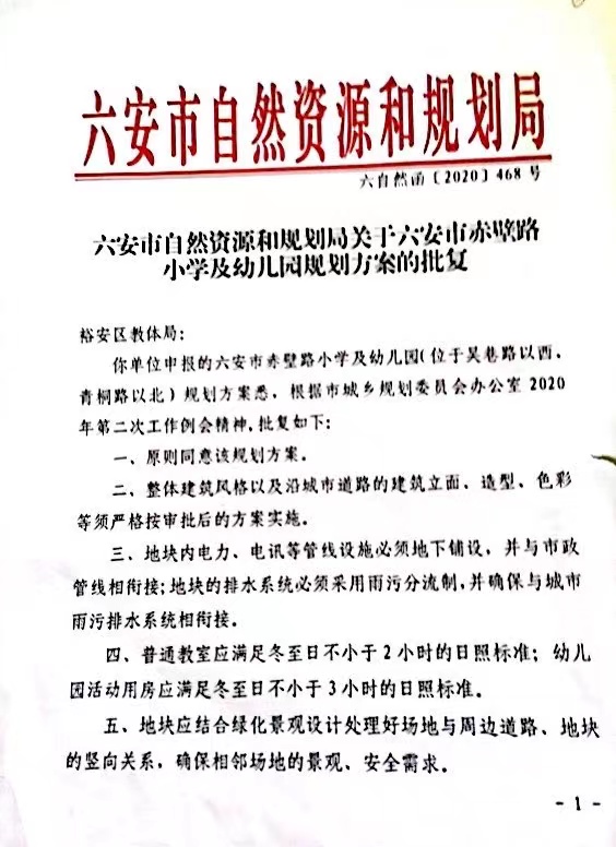 六安市自然资源和规划局关于赤壁路小学及幼儿园规划方案的批复
