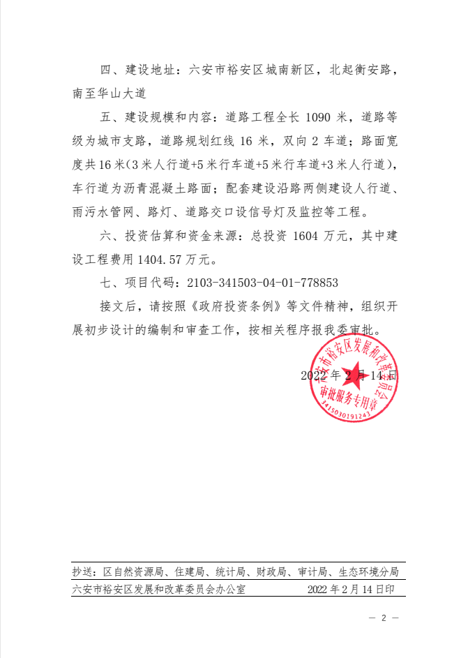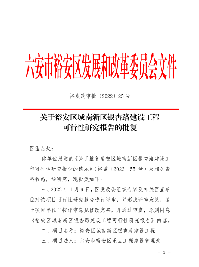 关于裕安区城南新区银杏路建设工程可行性研究报告的批复