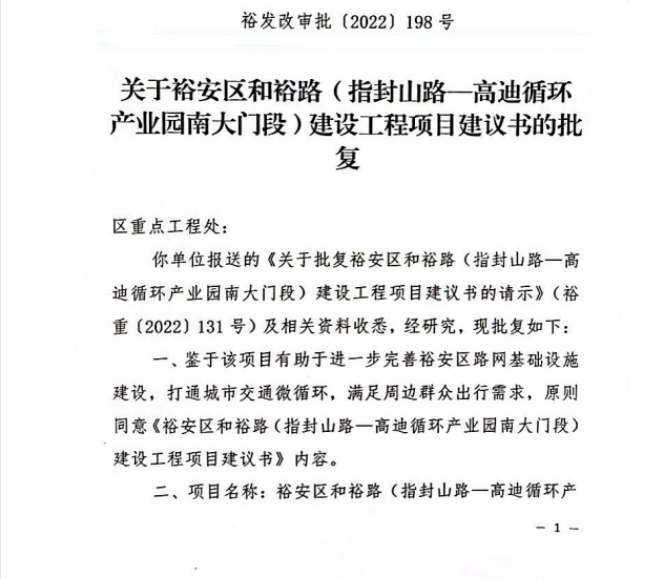 六安市裕安区发改委关于裕安区和裕路(指封山路-高迪循环产业园南大门段)建设工程项目建议书的批复