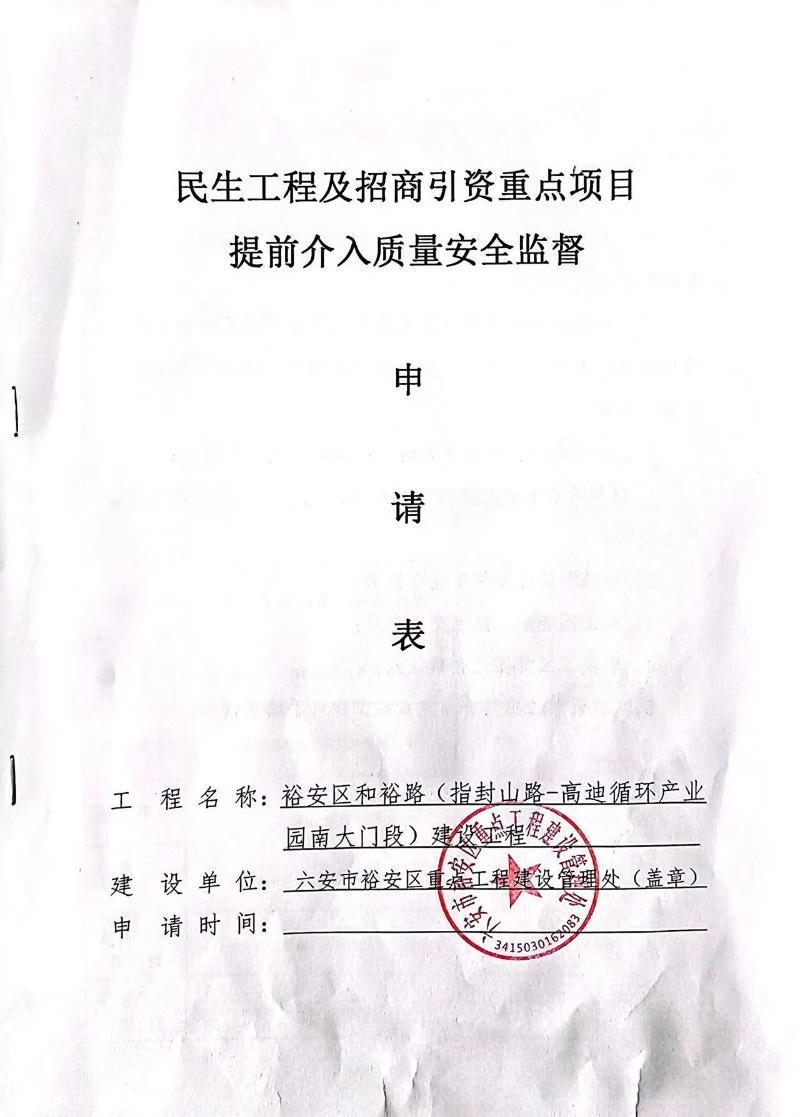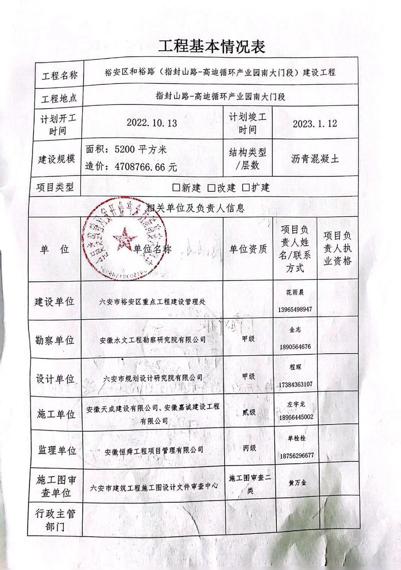 和裕路(指封山路-高迪循环产业园南大门段)建设工程质量安全监督信息