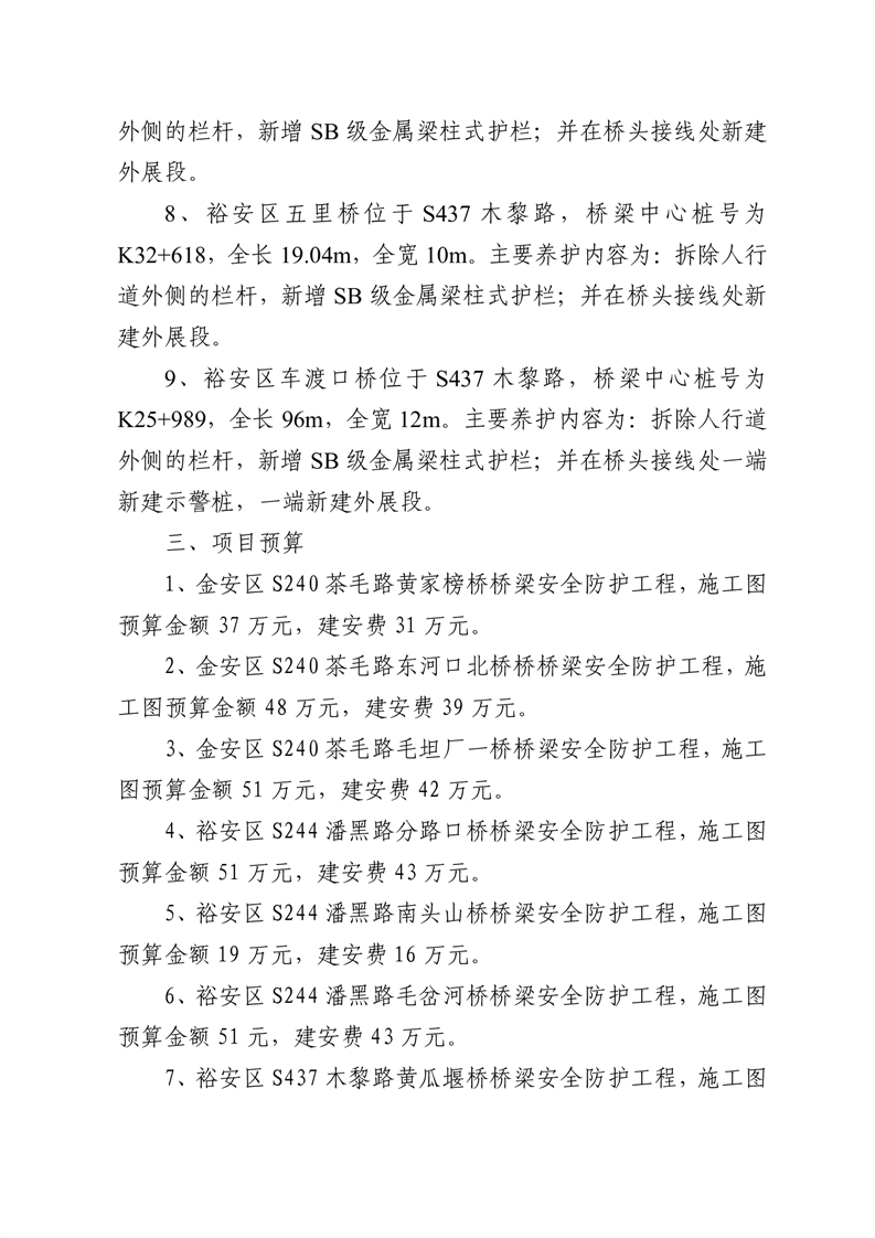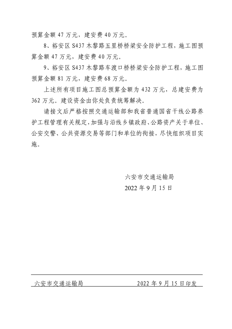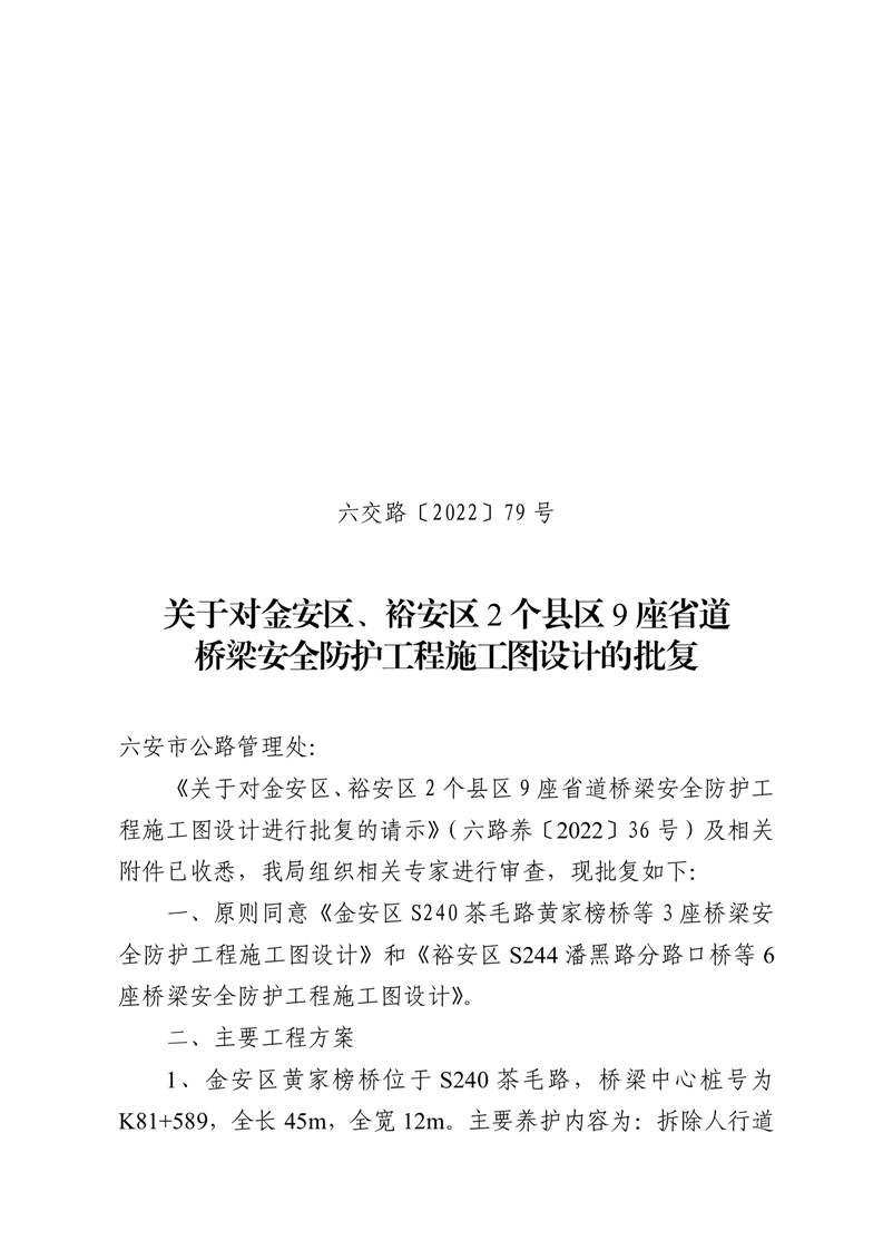 关于对金安区、裕安区 2 个县区 9 座省道桥梁安全防护工程施工图设计的批复