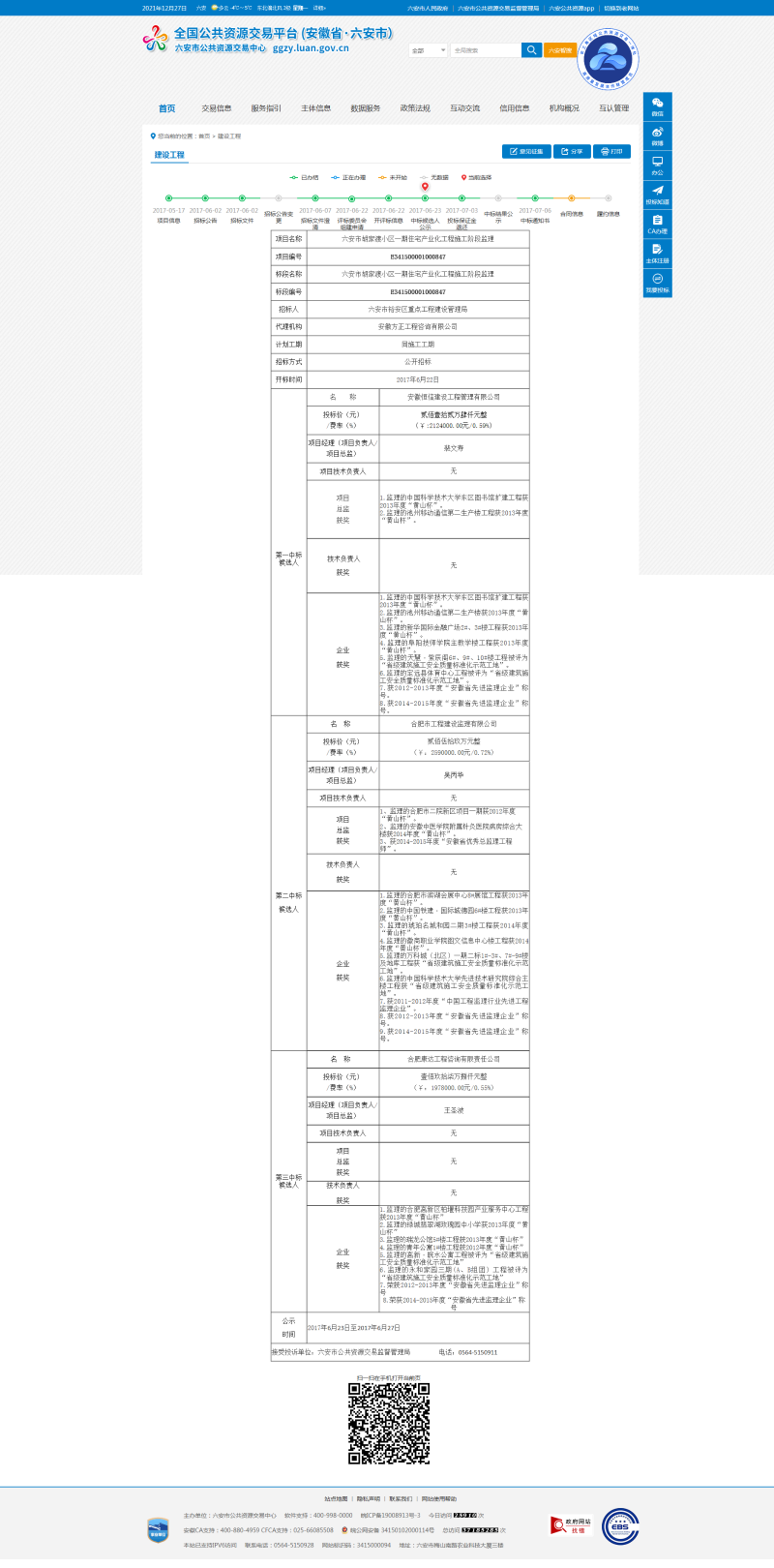 六安市裕安区胡家渡小区一期住宅产业化工程施工阶段监理中标候选人公示信息