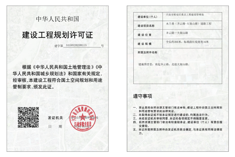 木兰巷(齐云路-大别山路)道路工程建设工程规划许可证
