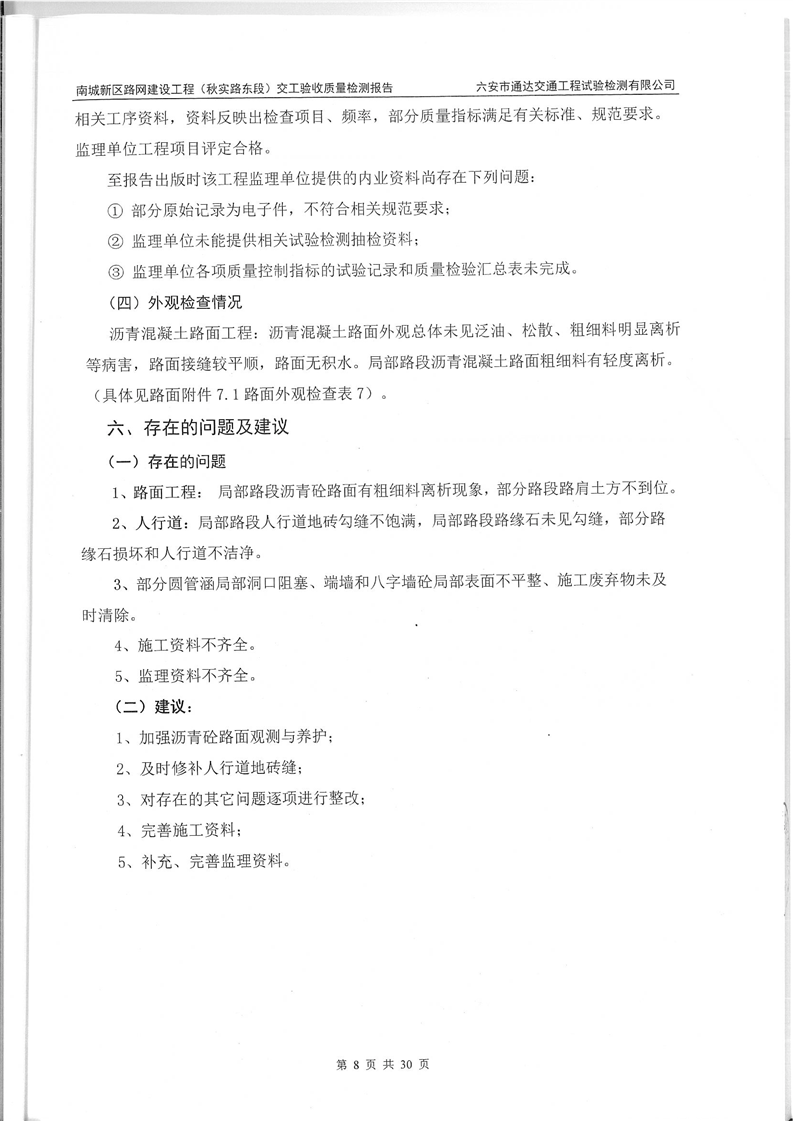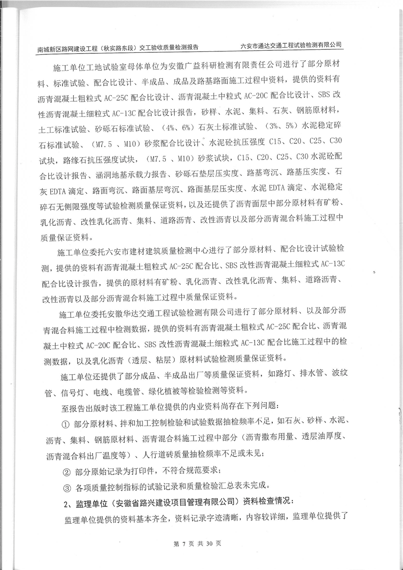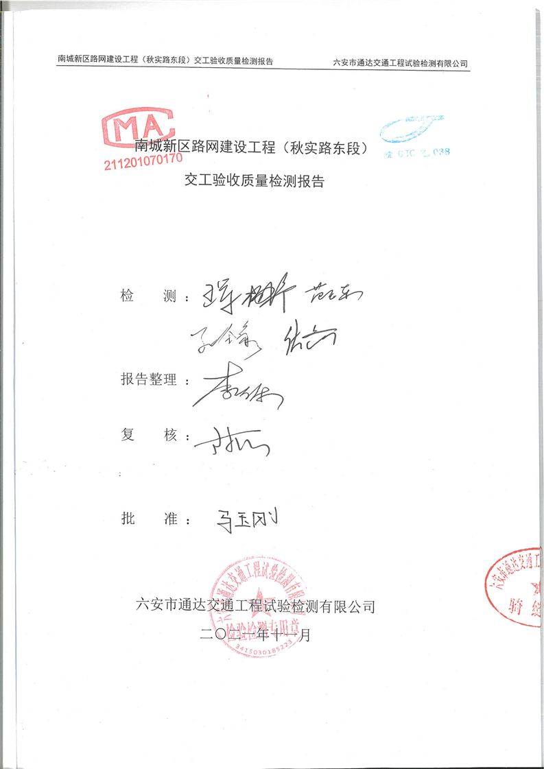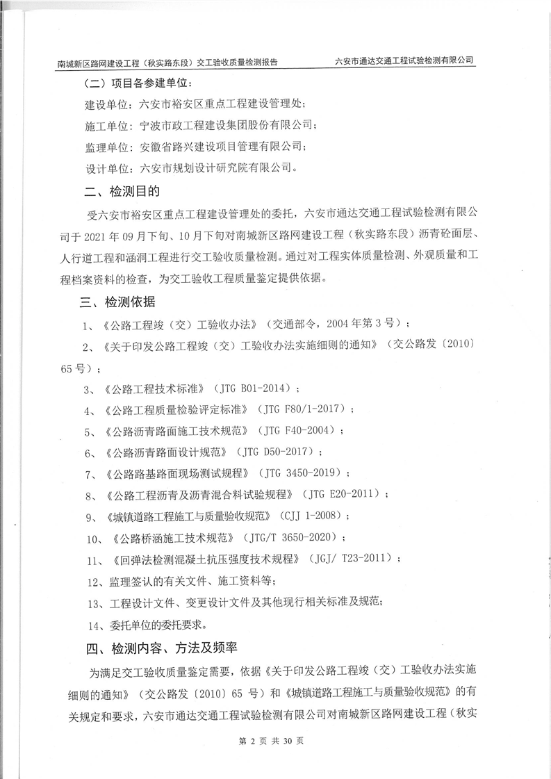 南城新区路网建设工程(秋实路东段)交工验收质量检测报告