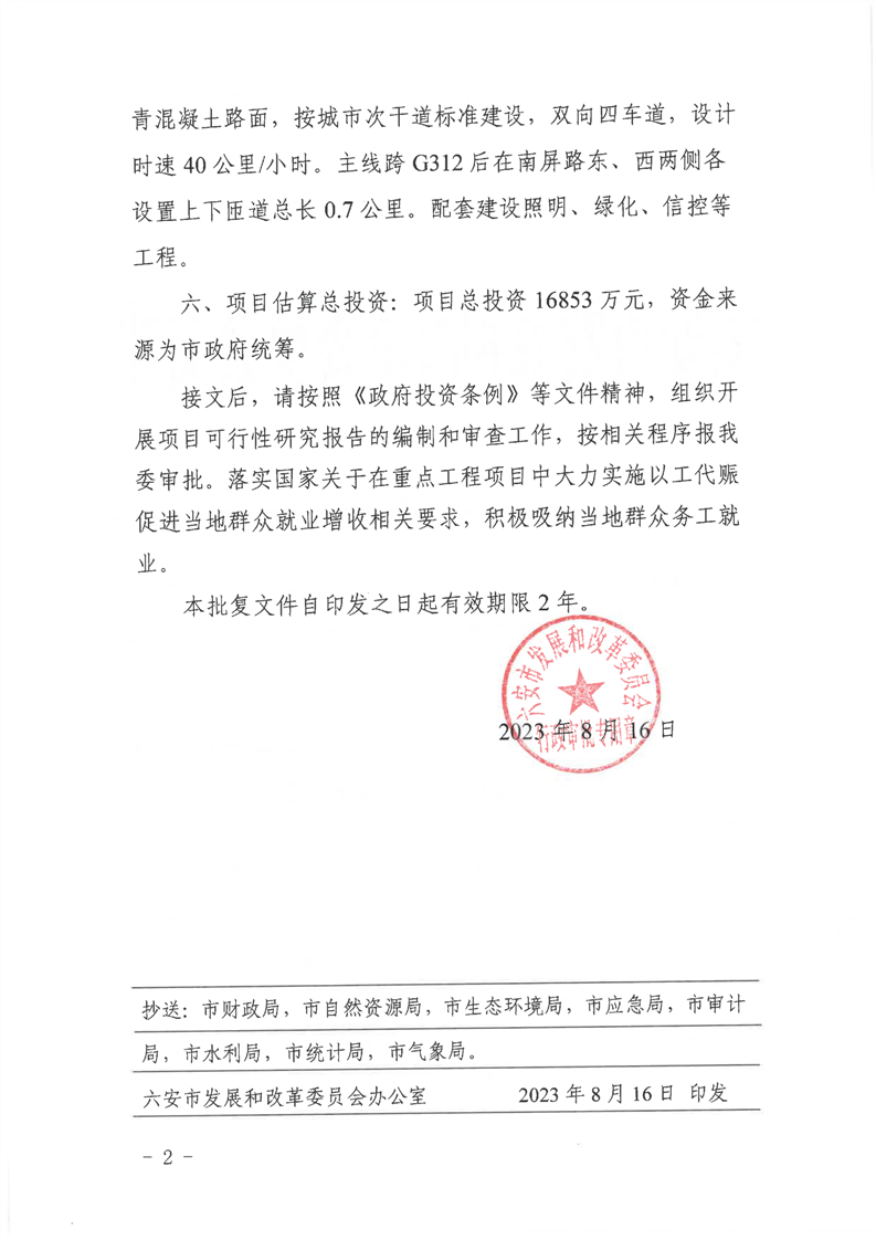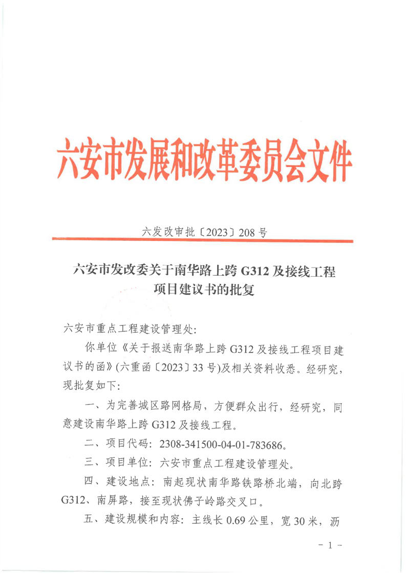 六安市发改委关于南华路上跨G312及接线工程项目建议书的批复
