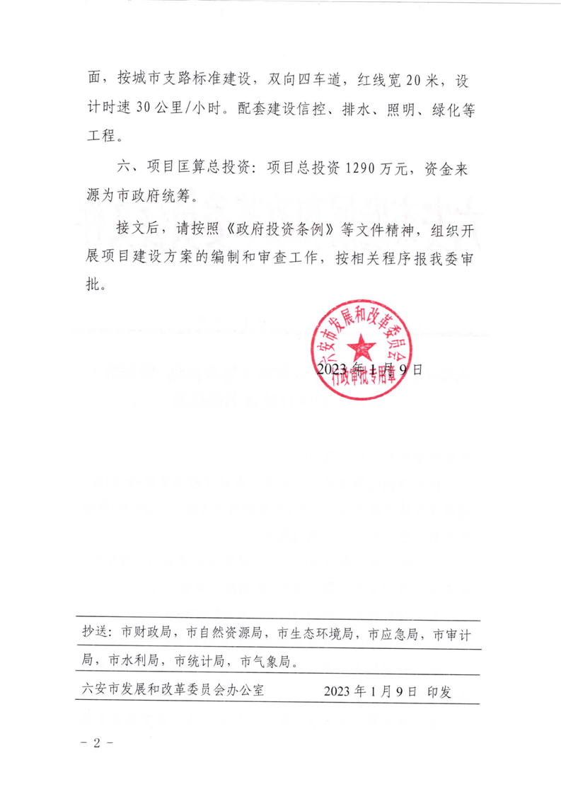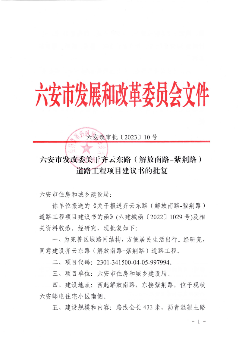 六安市发改委关于齐云东路(解放南路-紫荆路)道路工程项目建议书的批复