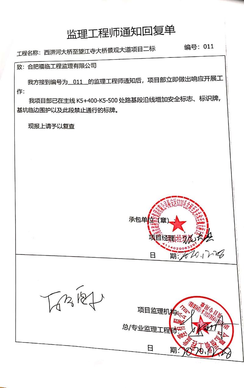 西淠河大桥至望江寺大桥景观大道项目二标(省道毛岔河至龙井沟至魏大桥段)监督检查回复单
