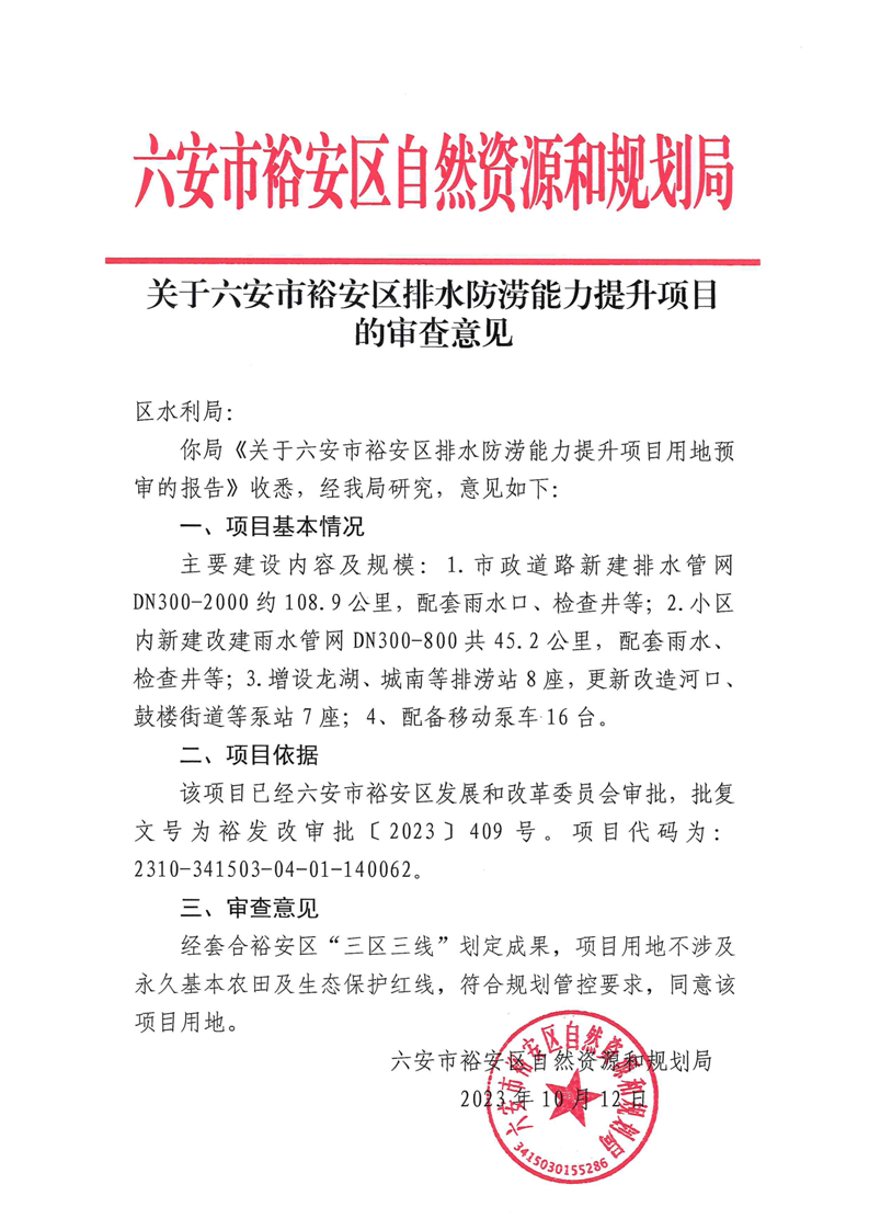 【用地审查】裕安区排水防涝能力提升项目的审查意见