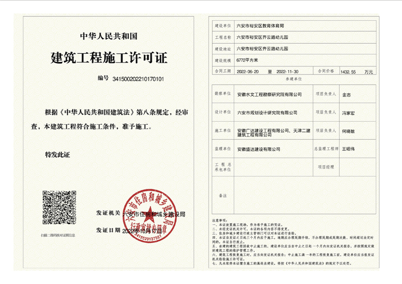 裕安区齐云路幼儿园施工许可证