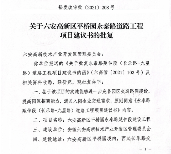 六安市裕安区发改委关于六安高新区平桥园永泰路道路工程项目建议书的批复
