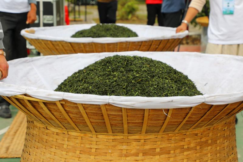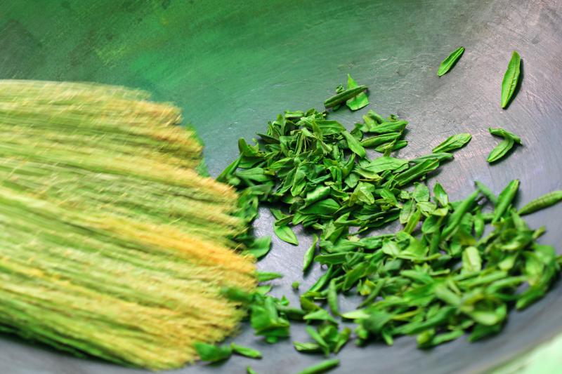 比赛现场,40名炒茶能手工匠现场炒茶,同台竞技。茶叶下锅,炒茶选手在锅温100℃的铁锅里巧手翻飞、嫩叶翻转,或压、或翻、或揉、或搓、或抖……全看手感,约30分钟后,现场缕缕清香弥漫开来。