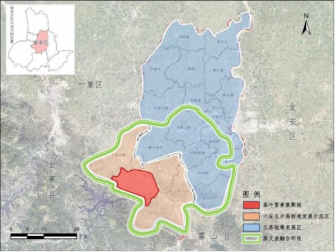 结合裕安区地形地貌和气候条件,将六安瓜片划分为两个产区:重点发展区(独山镇、西河口乡、石婆店镇)、其他产区(石板冲乡、青山乡)。重点发展区突出对生态环境、茶树品种、茶叶品质以及制作技艺、相关文化等全方位开展研究挖掘和传承保护,确保重点发展区产品优质和影响力。